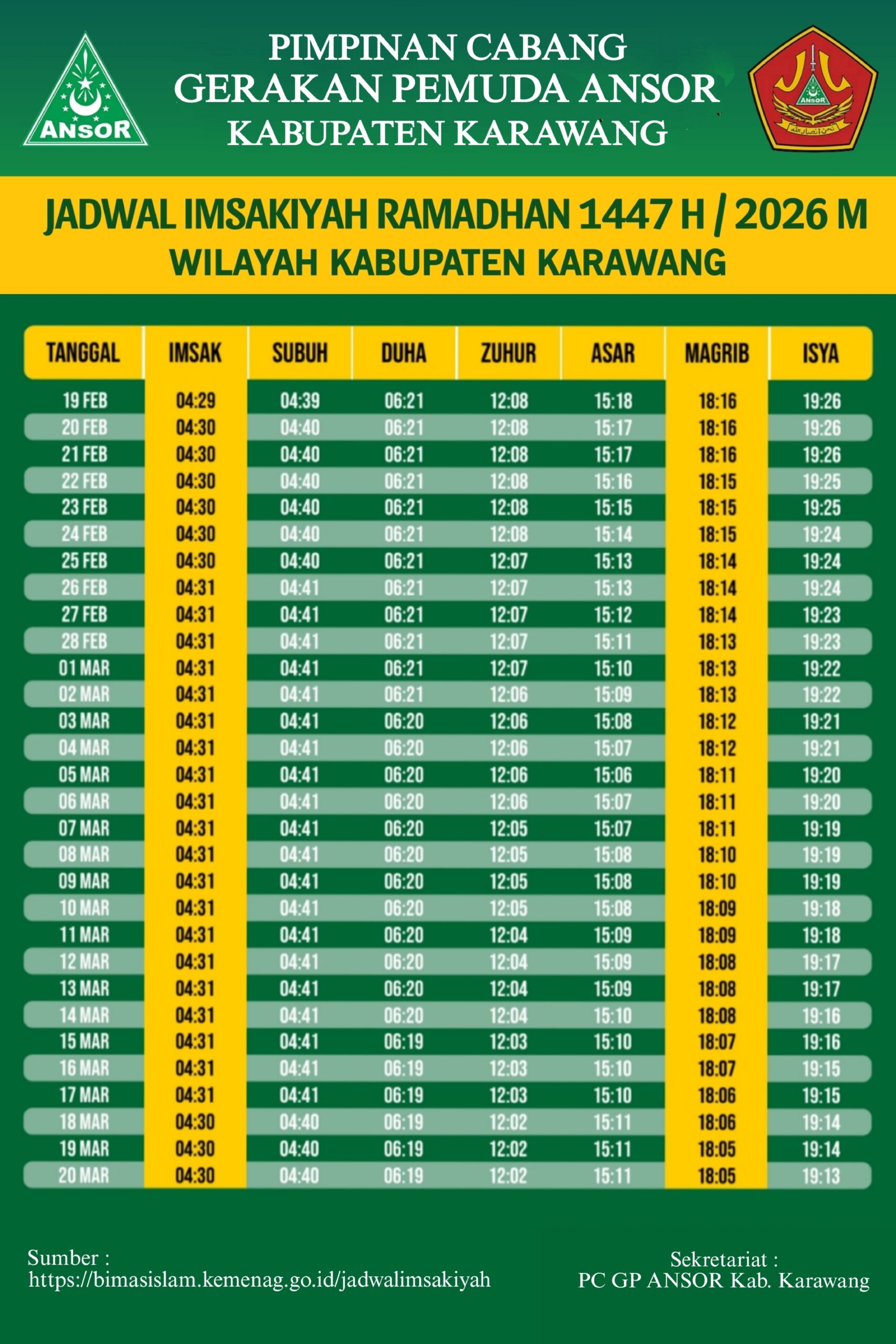Bulan suci Ramadhan merupakan momentum mulia untuk memperbaiki diri, menata niat, serta memperkuat ibadah kepada Allah SWT. Dalam rangka membantu menjaga ketertiban waktu ibadah selama Ramadhan, Pimpinan Cabang Gerakan Pemuda Ansor Kabupaten Karawang menyusun dan menghadirkan jadwal imsakiyah sebagai pedoman bagi kader Ansor dan masyarakat luas, khususnya di wilayah Kabupaten Karawang. Jadwal imsakiyah ini memuat…
